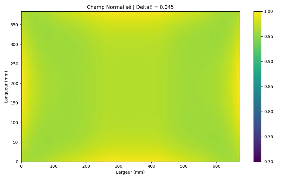Sans optimisation du système de chauffage, la première simulation en Figure 1 met en évidence des écarts de puissance infrarouge reçue atteignant 30% de puissance reçue en moins dans les coins du plateau. En laissant la main à notre fonction d’optimisation sur les paramètres du système, l’écart maximal est réduit à 4,5%, ce qui est illustré par la Figure 2. Ces premiers résultats, qui sont très encourageants, seront à confirmer par l’expérimentation dans le four une fois fabriqué. Nous serons alors capable de mesurer le champ de température réel, pas uniquement d’irradiance, qui est la résultante de nombreuses variables additionnelles.